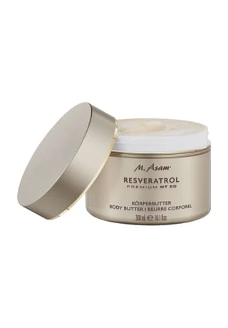 SPÜRBAR GLATTE UND STRAHLENDE HAUT. M.Asam RESVERATROL PREMIUM NT50 Körperbutter. Diese reichhaltige Körperbutter mit hochkonzentriertem Resveratrol aus der Weinrebe, Shea-, Kakaobutter und Vitamin E pflegt besonders intensiv und hinterlässt ein geschmeidiges Hautgefühl. Kaltgepresstes Traubenkernöl aus der familieneigenen Herstellung bewahrt Elastizität und Barrierefunktion der Haut. Quervernetzte Hyaluronsäure sorgt für eine sofort praller und glatter erscheinende Hautoberfläche. Die Körperbutter belebt die Sinne mit einem dezent frischen, zitrischen Duft. Sie nährt die Haut intensiv und bringt auch sehr trockene Hautzustände wieder ins Gleichgewicht. Die hochaktiven Wirkstoffe verleihen Deiner Haut neue Leuchtkraft und pflegen sie streichelzart.