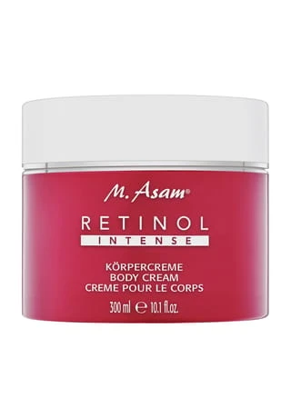 Die RETINOL INTENSE Körpercreme von M. Asam mit einer besonders hohen Konzentration an Retinol sorgt für ein jugendliches, strahlendes Hautbild. Retinol ist der weltweit bestuntersuchte Anti-Aging Wirkstoff, dessen hervorragende Ergebnisse in mehr als eintausend Studien nachgewiesen werden konnte. Die reichhaltige, sahnige Textur lässt sich leicht verteilen und zieht zügig ein. Der leicht süßliche, sinnlich-warme Duft verwöhnt dabei die Sinne auf eine luxuriöse Weise. Sie eignet sich insbesondere zur Regeneration von dünner, reifer und UV-lichtgeschädigter Haut. Sie erhält neue Leuchtkraft und sieht ebenmäßig und erholt aus. Außerdem verfeinert die Körpercreme sichtbar das Hautbild. Das hochkonzentrierte Retinol kann die Hautfestigkeit und -Elastizität steigern und für ein gefestigtes Hautbild sorgen. Wertvolle Öle wie Jojoba- und Moringaöl nähren trockene, anspruchsvolle Haut intensiv und schenkt ein spürbar geschmeidiges, zartes Hautgefühl. Die RETINOL INTENSE Körpercreme wirkt hautberuhigend, bringt sie wieder in Balance und steigert die Kollagenproduktion. Die Haut wird in ihren natürlichen Funktionen optimal unterstützt und wird bei regelmäßiger Anwendung deutlich fester, glatter und jugendlicher.