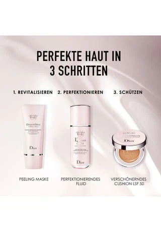 Dior erfindet die ikonische Pflege Dreamskin neu, um der Haut eine Perfektionierung zu schenken, die aus dem Inneren zu kommen scheint. *Die perfektionierende und wohltuende Wirkung dieses Fluids hilft, natürlich schöne Haut wiederherzustellen und bekämpft die sichtbaren Zeichen der Hautalterung. Die ungeschminkte Haut wirkt strahlender, wie geglättet und wird Tag für Tag schöner. Unter einer Foundation ist das Ergebnis erstaunlich.