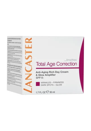 Die leuchtkraftunterstützende Anti-Aging Rich Day Cream mit Sonnenschutzfaktor 15 von LANCASTER TOTAL AGE CORRECTION AMPLIFIED ist die erste LANCASTER Hautpflege, welche sowohl die Anti-Aging-Wirkung als auch die natürliche Leuchtkraft der Haut verstärkt. Lancaster’s 3 bewährtesten Anti-Aging-Technologien in einem Tiegel, verstärkt mit neuesten Innovationen. Ihre Haut erscheint sofort strahlender, geschmeidiger und ebenmäßiger. Konturen scheinen gestraffter, definierter und jünger – Tag für Tag.